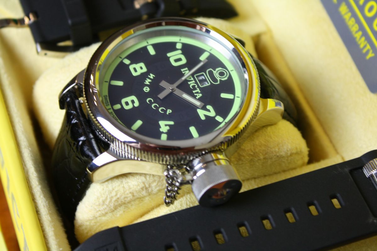 Invicta Russian Diver. Invicta Russian Diver Qtz SS Black. Movement:Quartz, Jewels:, Case Size:52mm, Crystal:Mineral, Crown:Screw Down, Dial:Matte, Dial Color:Black, Origin:Swiss, Water Resistant:100m, Plating:Stainless Steel, Band:26mm, Band Material:Rubber/PU