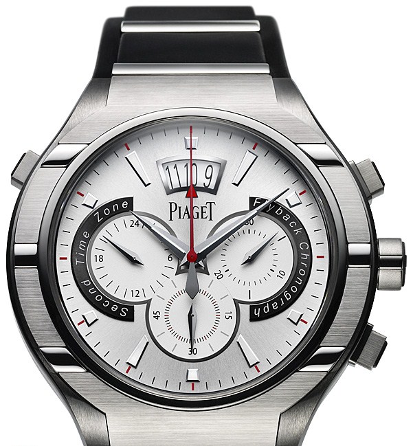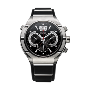 45 мм. Корпус из титана с рельефными полосками из стали. Циферблат с люминесцентными часовыми индексами. Задняя крышка из сапфирового стекла. Ультратонкий мануфактурный механизм Piaget 880P с автоматическим подзаводом. Хронограф, малая секундная стрелка, указатель даты, указатель времени второго часового пояса.