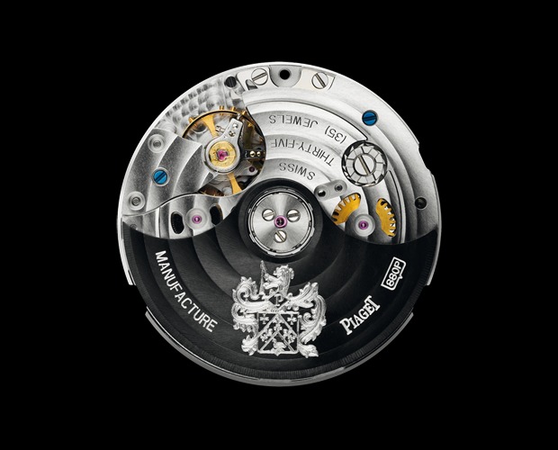 Ультратонкий мануфактурный механизм с автоматическим подзаводом Piaget 855P с вечным календарем, ретроградными указателями даты и дня недели и указателем второго часового пояса.