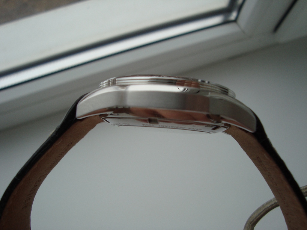 о самих часах. В часах стоит механизм 46H (EY); 23 камня; автоподзавод (ручного подзавода и стоп-секунды нет); плоское сапфировое стекло (какое стекло на задней крышке не знаю); водозащита 100 метров; точность хода, заявленная производителем +25/-15 сек/сутки. Функции - отображение часов, минут, секунд, дата, индикатор запаса хода, мировое время GMT в 24 часовых поясах (по городам). Кожаный глянцевый ремешок чёрного цвета, стилизованный под кожу крокодила. Застёжка "бабочка", что очень удобно.