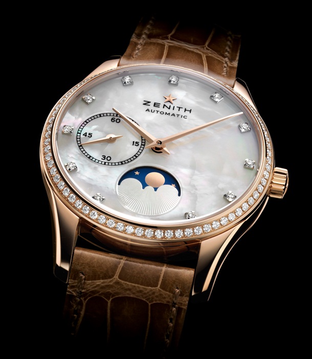 В положении «4 часа 30 мин» находится окошко даты. Мануфактура Zenith предлагает широкий ассортимент версий данной модели (с циферблатом цвета стали или голубого льда; c циферблатом из перламутра; с часовыми метками, украшенными бриллиантами; и даже с металлическим браслетом), среди которых прекрасные дамы смогут выбрать наиболее подходящую им по стилю.