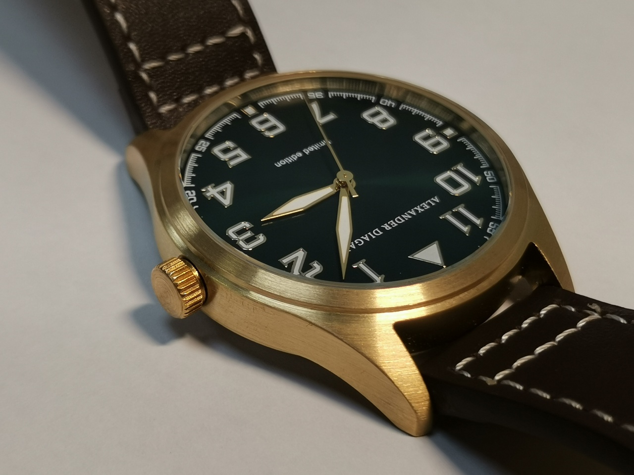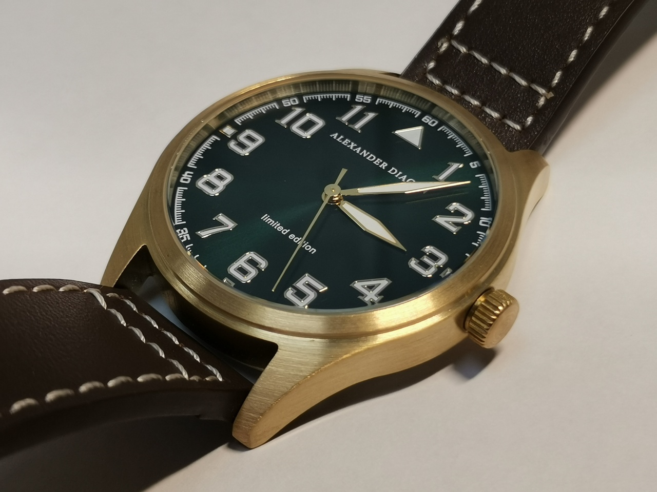 Модель под названием EARTH от российского бренда Alexander Diagan единственная изготовленная из бронзы(на данный момент). Часики на бюджетном кварцевом механизме Мийота, выполнены в стиле пилотов с характерными стрелками и крупными часовыми метками. Производится данный продукт в Китае.