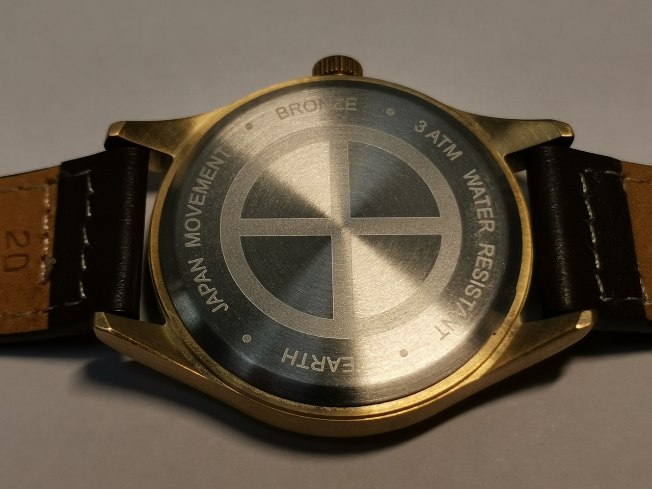 Задняя крышка слегка приподнятая, плоская, радиально сатинирована. На крышке неглубоко гравированы надписи: EARTH, japan movement, Bronze, 3 atm water resistant. В центре крышки размешен "знак" серии - крест в круге.
