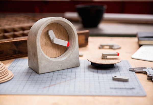 Голландская студия дизайна Studio PS, представила бетонные часы с деревянным циферблатом - Moak Clock. Этот простой интерьерный элемент строгих очертаний с немного озорным дизайном. Корпус и стрелки выполнены из бетона, со всеми, присущими ему чертами: грубоватостью и шероховатостью, а циферблат из дубового шпона без цифр и делений смягчает внешнюю холодность объекта.