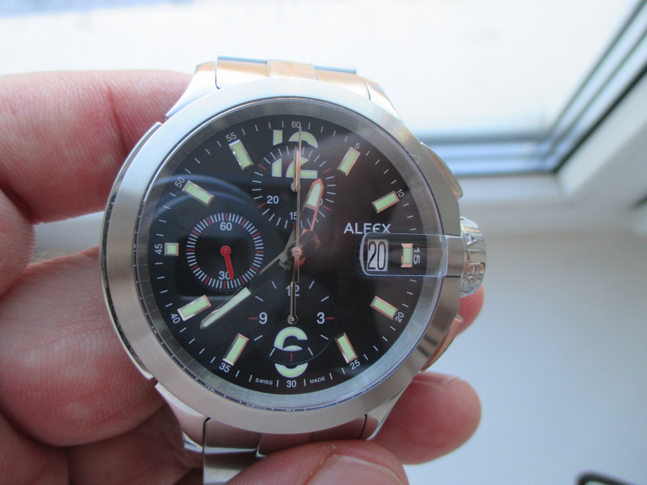 Изначально хотел кварцевый хронограф с wr не менее 100м. Что то не нашёл ничего что понравилось бы и полностью устроило. Случайно заметил часы Альфекс, данный хронограф на вальжу 7750, очень приглянулись. Решил брать и использовать как спортивные часы, не взирая на отсутствие кварца. Говорят что вальжу выносливый механизм, буду проверять. Часы массивные и тяжелые. 44 мм на 20мм в толщину. Обработка очень качественная. есть и сатинирование и полировка. Читаемость на 5+. Хорошо и в темноте и на свету. На руке приятно сидят. Начал даже носить часы дома, хотя раньше не носил. Вообще и дизайн порадовал и цена. Очень приятные часики. Представлял коллекцию лыжник Бернард Русси. Это его подпись на заднем стекле.