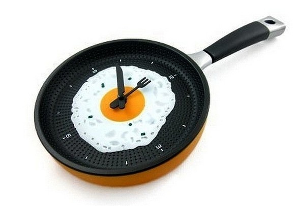 Предлагаем оценить новую идею, которая придется по вкусу в первую очередь хозяйкам с нетривиальным взглядом на оформление их кухонных помещений. Яичница-глазунья с ярко-оранжевым желтком и пузырящимся белком растеклась по сковородке и выглядит очень натурально и аппетитно. Эффект усиливают стрелки в виде ножа и вилки, кружащие вдоль расположенных на дне сковородки белых арабских цифр и индексов.