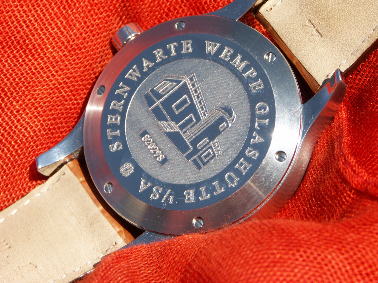 А что часы? Часы дико понравились. Стрелки и метки полированные, играют от ослепительных солнечных зайчиков до черного цвета. На циферблатной морде – любимые три стрелки, дата и немецкоговорящий запас хода. Сзади – глухая крышка на винтах с выгравированным планетарием. Кто-то говорит, что это часовая контора, но на планетарий больше похоже. Ну и надпись WEMPE, которая тоже радует глаз, чего стесняццо?