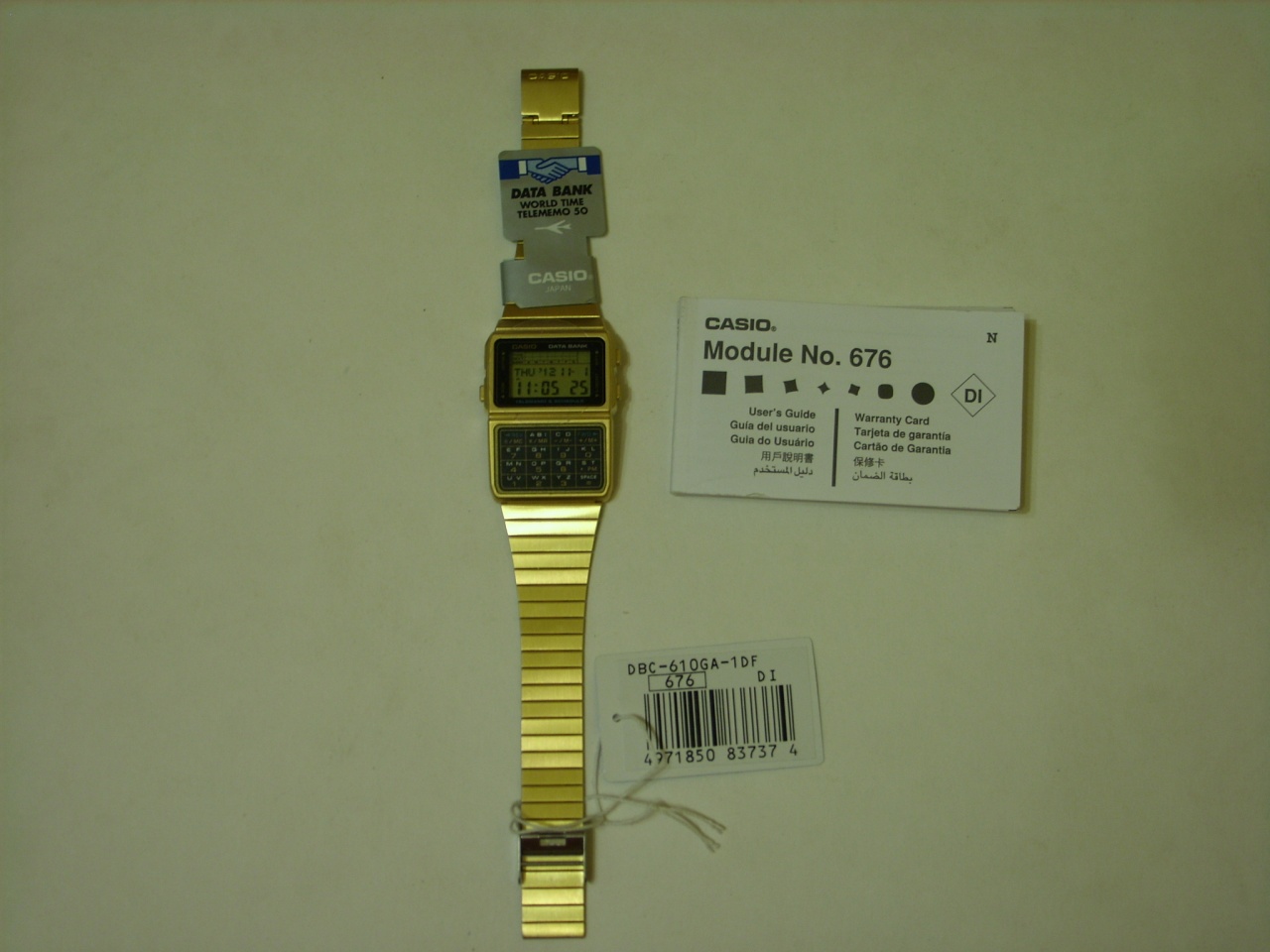Уважаемые форумчане представляю вашему вниманию Casio DBC-610 серии Data Bank. Долго определялся с выбором часов. Сначала свой взгляд останавливал на шоках серии 6900, показались массивными. Затем смотрел в сторону минишоков той же 69 серии - не устроила цена. Так же дорогими показались белые GWM 850. И однажды на ибее наткнулся на представляемые мной DBC-610. Выбор в датабанковской серии большой начиная с простых DB -200 и заканчивая, как мне показалось ,самой продвинутой моделью DBC-610. Определенную роль в выборе именно этой модели сыграло наличие таких же(кмк) часов у Андрея Малахова. Так же дала о себе знать ностальгия по 80-м годам прошлого века. И недолго раздумывая я обратился за помощью купить мне эти часики к небезизвестному и уважаемого мной JediNewTime. Заказ был сделан 13 октября и спустя 18 дней , т.е. 1 ноября, я получил на почте мелкий пакет из Гонконга. Это был обыкновенный конверт, содержимым которого было две вещи : часы и нерусифицированная "камасутра". В пластиковй корпус часов вживлен 676 модуль. Браслет нерж. лицевая сторона покрыта "золотом" , внутренняя без покрытия. Застежка позволяет быстро ориентировать браслет практически на любое запястье. Это удобно. Функционал модуля позволяет: читать время, дату,год,день недели ; записывать данные в режиме записной книжки ; имеется режим расписания до 50 записей ; производить математические действия ; определять время в 24 городах мира ; устанавливать одинарный ежедневный будильник ; таймер countdown до 24 ч. ; секундомер с дискретностью в сотые доли сек. Так же присутствует традиционный ежечасный двойной бип. Что еще можно сказать? Кнопки клавиатуры и боковые "легкие" в нажатии, не как на mudman. Браслет красиво переливается звеньями при освещении и волосы на руке пока не щиплет. Подсветка зеленым диодом, достаточно, что бы прочесть что либо в темноте. Из минусов считаю отсутствие влагозащиты, пластиковый корпус (металл было бы лучше), не громкий сигнал, не знаю на сколько хватит "золотого" покрытия. Остальное, при аккуратном ношении, не критично. На мой взгляд - эффектные часы и мне очень понравились. Доволен, как слоник.
