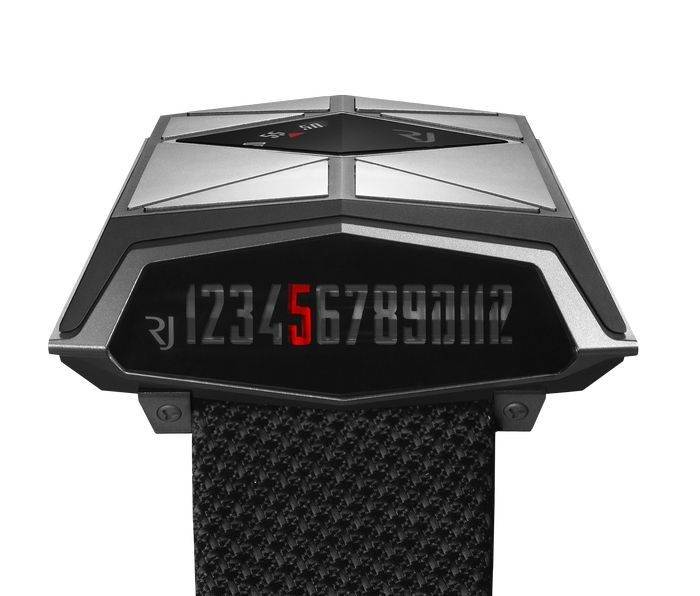 У модели трапециевидный корпус, выполненный из титана, покрытого черным PVD. Верхняя его часть декорирована блестящими на темном фоне титановыми треугольниками, из которых сформирован фацетный орнамент. Глаз не сразу различит среди них окошко дискового индикатора минут. А чтобы узнать который сейчас час, нужно посмотреть на передний край корпуса, где расположилась соответствующая шкала. Текущий час на ней отмечается красным курсором. Корректировка времени производится при помощи заводной головки на условных «12 часах».
