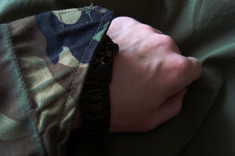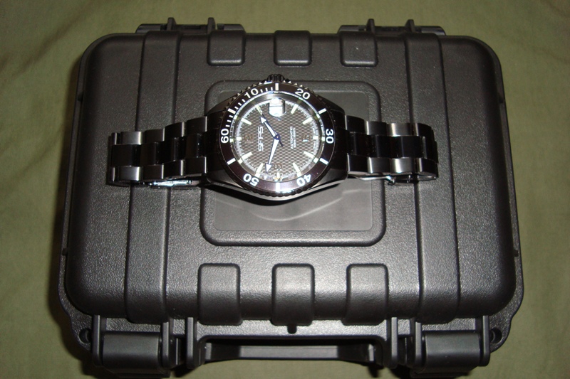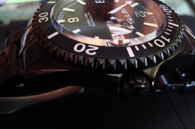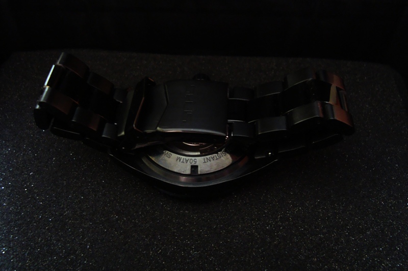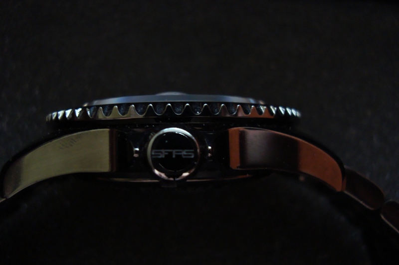 Кстати о безеле, как ранее уже сообщал, он является однонаправленным и что действительно понравилось чёткая фиксация, без какого-либо люфта. Суммарная толщина корпуса 14 миллиметров. Корпус и браслет выполнены из гипоаллергенной хирургической стали SS316L с чёрным IP покрытием нанесённым ионным способом на уровне кристаллической решётки.