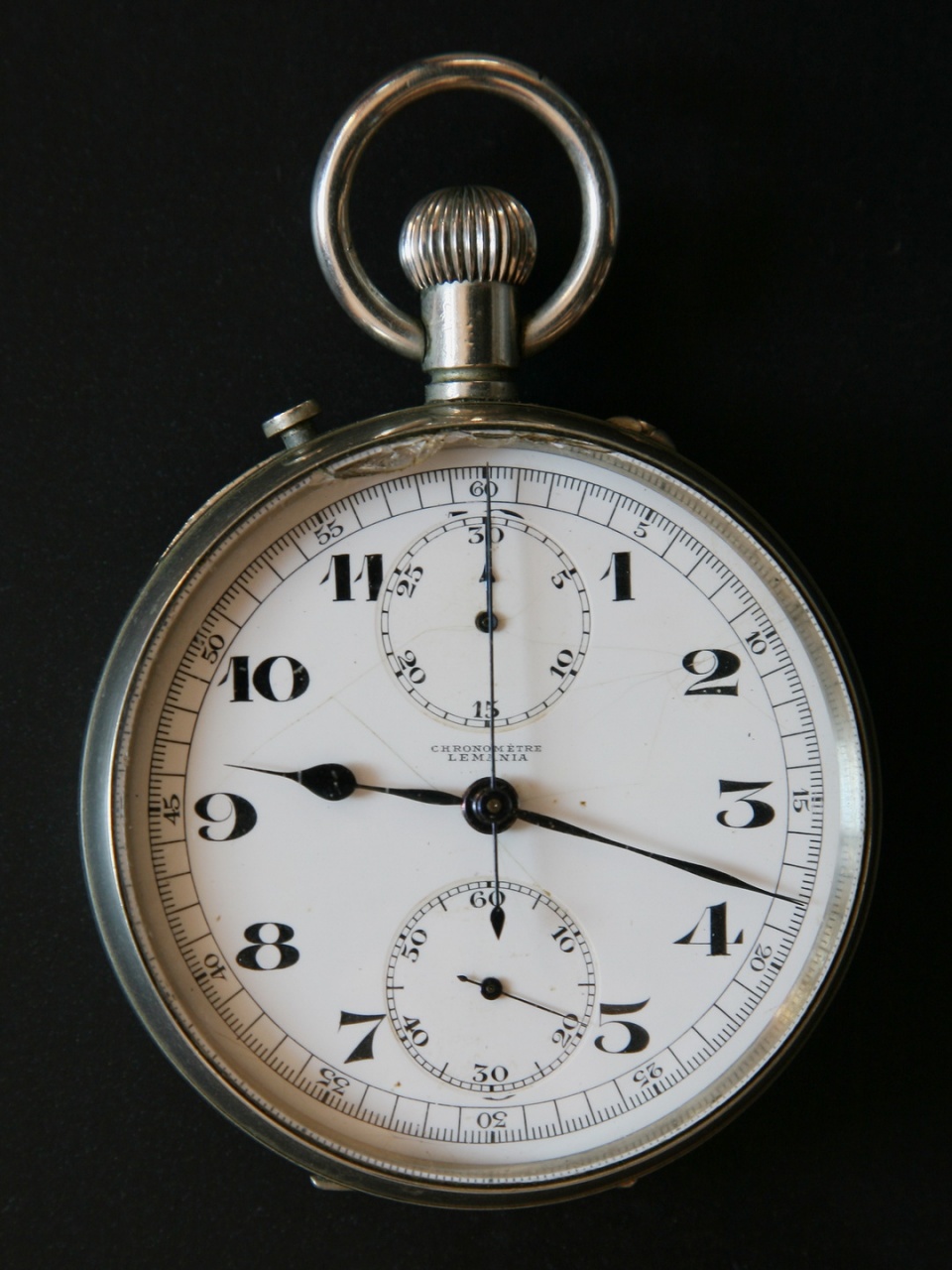 Циферблат металлический. Две центральных секундных стрелки сплит-хронографа, смещенный вверх 30-минутный счетчик-регистр. Дополнительный секундомер внизу. Стрелки красивого синего воронения. Подписан фирменным логотипом LEMANIA. Сертифицированный хронометр - надпись на циферблате chronometre. Механизм с клеймом LEMANIA.
