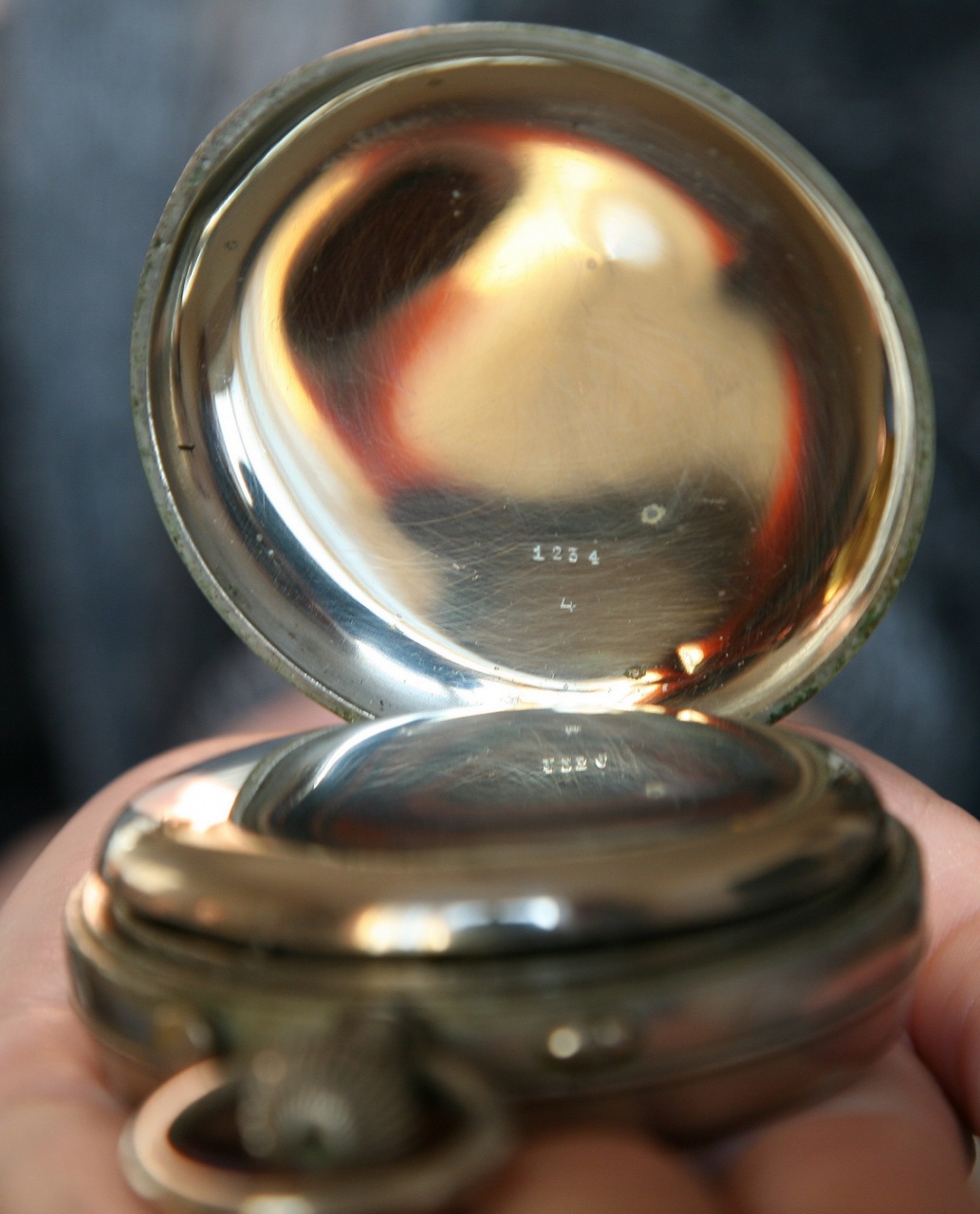 Корпус двухкрышечный с крышками на шарнирах. Задняя крышка гладкая без надписей, внутри пробит серийный номер 1234. Ниже – 4. На внутренней (второй) крышке цифра 4. Крышки закрываются плотно, состояние идеальное.