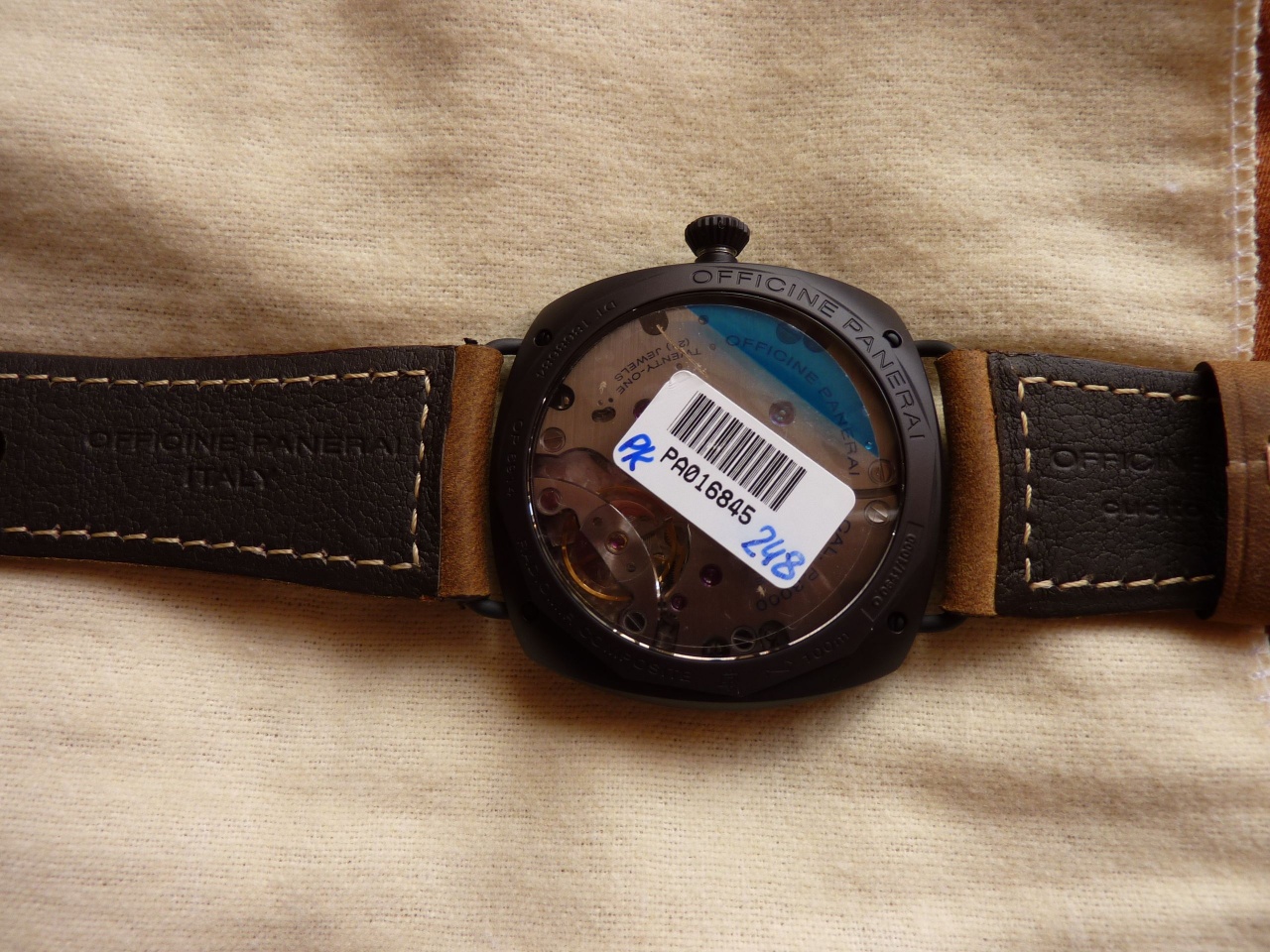 Механизм Механический с ручным заводом, калибр Panerai P.3000, производство Panerai. Корпус Диаметр 47 мм, коричневый композит Panerai, со съемными проволочными ушками. Фирменная завинчивающаяся заводная головка c логотипом OP.