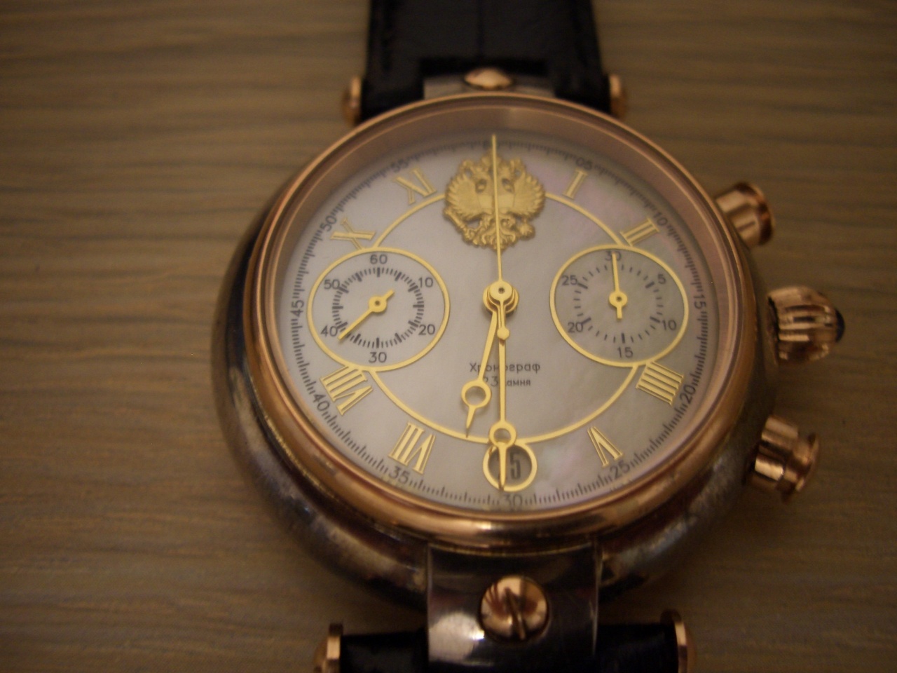 Золотые мужские часы "Президент". Корпус комбинированный Серебро/Золото 36.84\13.39гр. Сапфировое стекло. Ручной подзавод. Синий сапфир в заводной головке. Циферблат натуральный перламутр. Цифры, стрелки, гербы из золота. Русский хронограф с швейцарской родословной