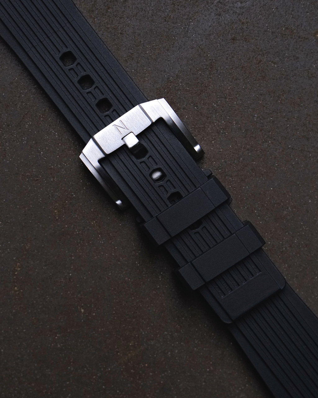 Концепция часов продумана до мелочей. Даже профиль бакли - чётко по размеру ремня. Ремень мне показался тонковатым. Пересадил на Ди-Модел Торнадо. Ширина между ушками - почти 23 мм. При желании можно втиснуть и "тяжёлую артиллерию" на 24 мм, но для моего запястья в 16 см это перебор. А вот гравировка порядкового номера и координат - очень мелкая. Полировка торцов строго противопоказана. Как бы патинирование эти надписи не съело