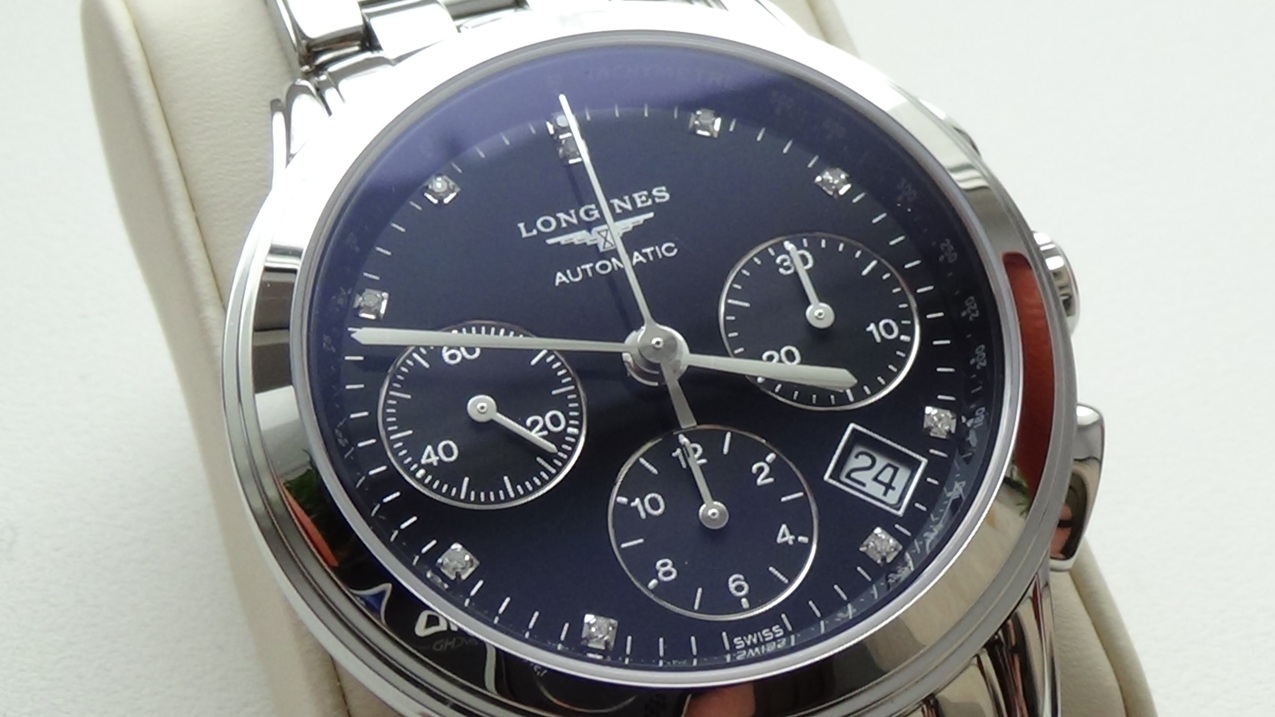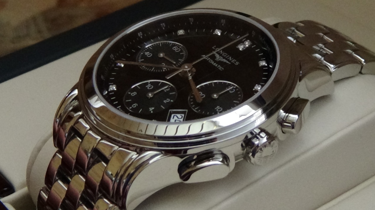 Немного поделюсь впечатлениями. Волнительная неделя ожидания и вот я уже счастливый обладатель хронографа Longines Les Grandes Classiques Flagship (L4.803.4.57.6). При первом взгляде на них сразу отметил для себя, что те немногочисленные фотографии их в Сети в крайне незначительной степени способны передать всю красоту, изящество, качество и тонкость исполнения этих часов, что впоследствии было по достоинству оценено друзьями и коллегами. Серебристые стрелки, надписи, и тонкие окантовки шкал накопителей хронографа и апертуры, а также "каменные" метки - всё это очень органично сочетается с контрастным черным циферблатом. Причем, насколько черным может быть черный цвет, я понял когда положил их рядом с другими своими часами тоже с черным циферблатом)). Шкалы накопителей тоже имеют свой еле различимый оттенок черного и микроузор, видимый только при хорошем увеличении. Шкала тахиметра практически незаметна и совсем не загромождает циферблат, но она есть и когда нужно и кому нужно ей всегда можно не напрягаясь воспользоваться. Одним словом, эргономика на высоте, внимание уделено каждой мелочи и каждая эта мелочь приятно радует и удивляет, а часы полностью соответствуют моим ожиданиям и пожеланиям при выборе часов с элегантным классическим дизайном. К сожалению, нет фотоаппарата, чтобы свои впечатления хоть как-то задокументировать. За месяц использования точность хода составила +4 сек./сутки.