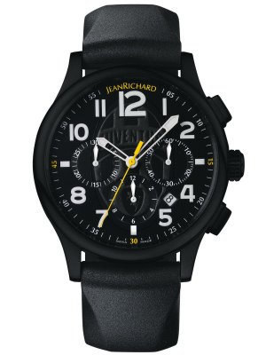 Новая модель от JEANRICHARD - хронограф JUVENTAS (Ref. 32112-13-128) имеет круглый корпус из нержавеющей стали с черным PVD-покрытием, диаметром 43 мм, толщиной 13,10 мм, водонепроницаемый до 30 метров. Изогнутое сапфировое стекло. Задняя крышка корпуса на семи винтах.