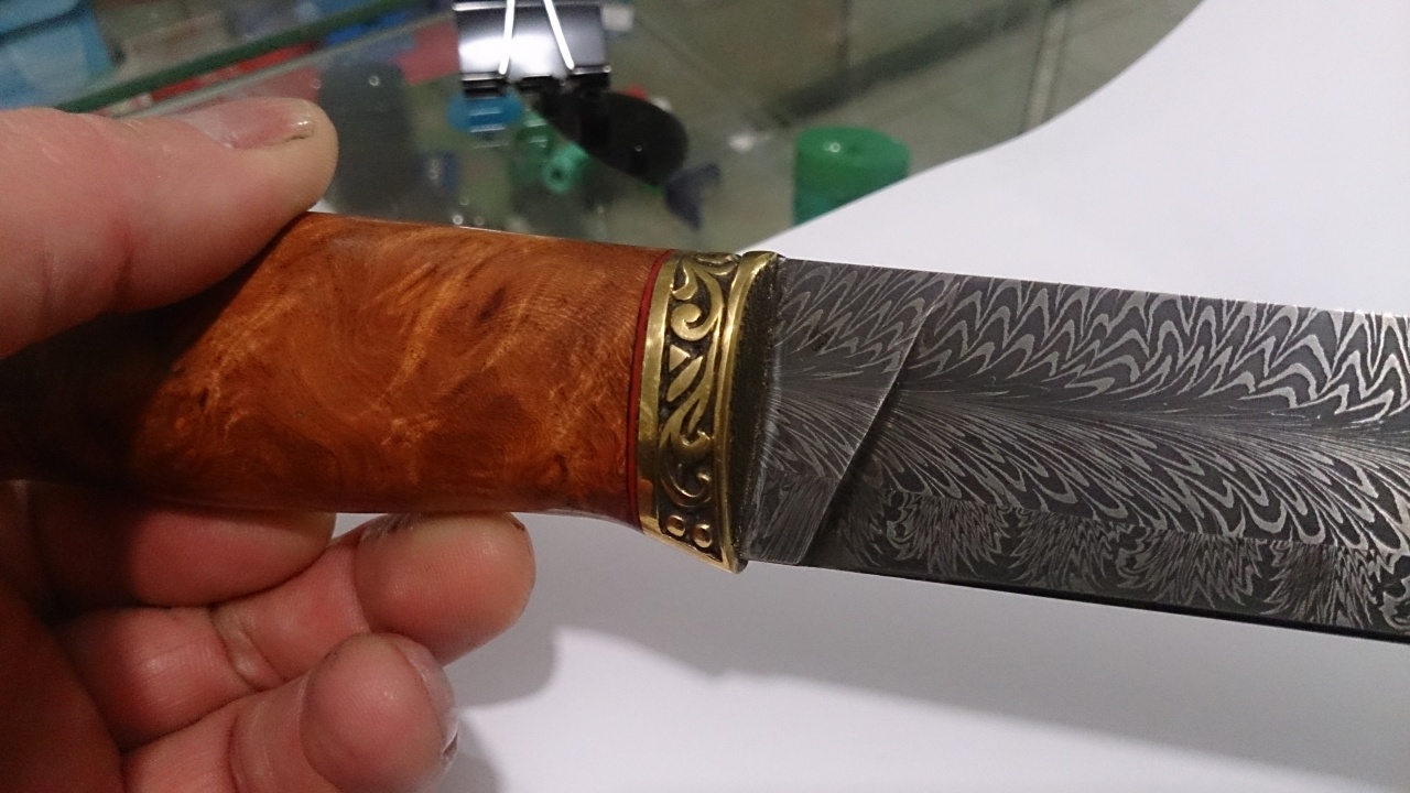 Продам нож из личной коллекции, клинок Тихомирова многослойный дамасск 115/30/4 общая длинна 290, рукоять AMBOYNA , больстер и навершие из латуни.Ножны кожа КРС подвес свободный.Нож заточен. Автор работы известный в ножевом мире мастер из Москвы "ED3". Пересыл в любую точку РФ ,наложенный платеж. цена 15тр.