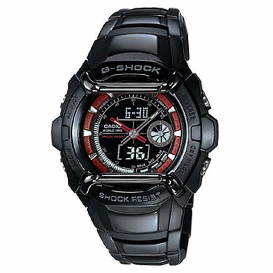 Редкая модель, уже не выпускается. Часы очень эффектные: черный стальной корпус с металлическими дужками, циферблат черного цвета с красным внешним ободком, черный литой браслет.