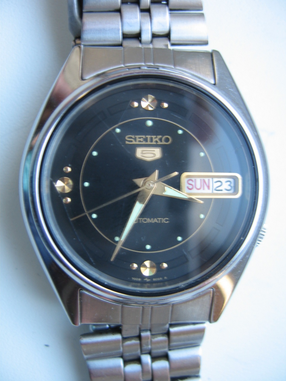 Циферблат: черный с люминисцентными стрелками и метками; индикатор дня недели и даты на позиции "3 часа"
