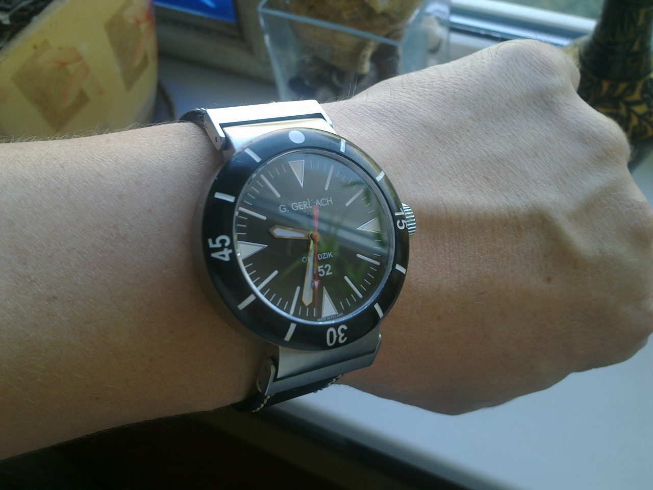 Продаются красивые дайверы от польской компании Gerlach. Часы на кожаном ремне со строчкой плюс есть еще отличный металлический браслет (удалены два звена под размер 18 см.) и каучуковый ремень. Часы почти не носились, т.к. оказались слишком тяжелыми, особенно на браслете, для нынешнего владельца.