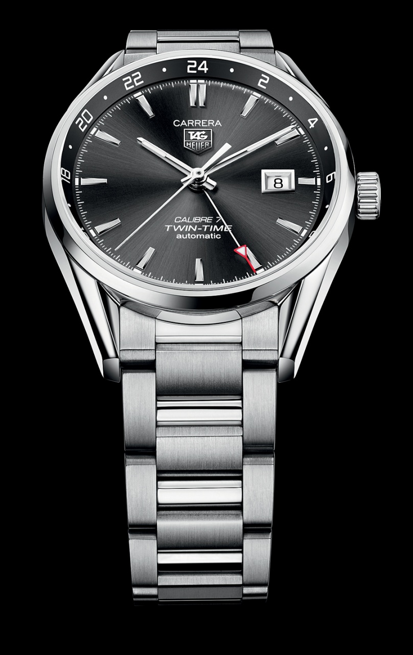 Новая модель Carrera Calibre 7 Twin-Time от швейцарской часовой компании TAG Heuer имеет круглый полированный корпус, изготовленный из нержавеющей стали, диаметром 41,0 мм, водонепроницаемый до 100 метров. Завинчивающаяся рифленая заводная головка расположена на 3 часах. Сапфировое стекло установлено на передней стороне корпуса (выпуклое) и на его завинчивающейся задней крышке. Циферблат черный с лучистой отделкой, накладными часовыми индексами, часовой, минутной и GMT стрелками, покрытыми люминесцентным составом белого цвета.