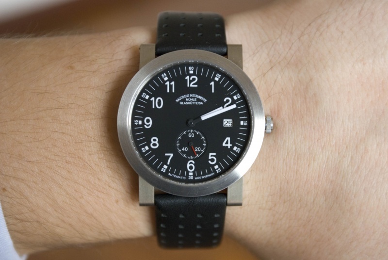 - Muhle Glashutte (Германия) стальные с автоподзоводом циферблат черный стрелки белые на черном кожанном ремне (фото)