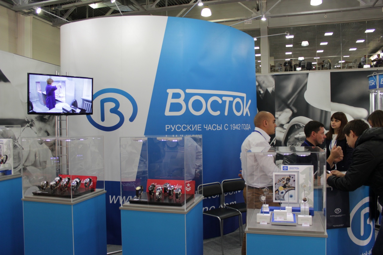 У Востока был большой павильон, оформленный в фирменных цветах компании. Слева были расположены стенды с выкладкой часов: женские модели, новые командирские, командирские К-34 и механизмы. Так же слева был расположен большой экран, который демонстрировал ролики о работе завода. Ролики показывали, как происходит сборка часов, проверка механизмов, описывались технологические процессы. В центре павильона находилась стойка с выставленными новыми моделями командирских часов, там же были