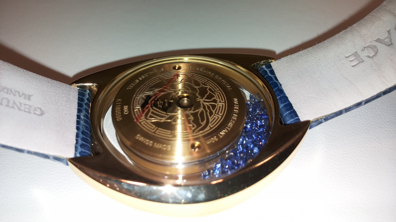 Корпус: полированная сталь, IPYG - покрытие, гравировка Versace, индивидуальный номер на задней крышке; внешний корпус имеет текстуру "clous de Paris", 50 голубых сапфиров в прозрачной части корпуса (ct. 2,0)