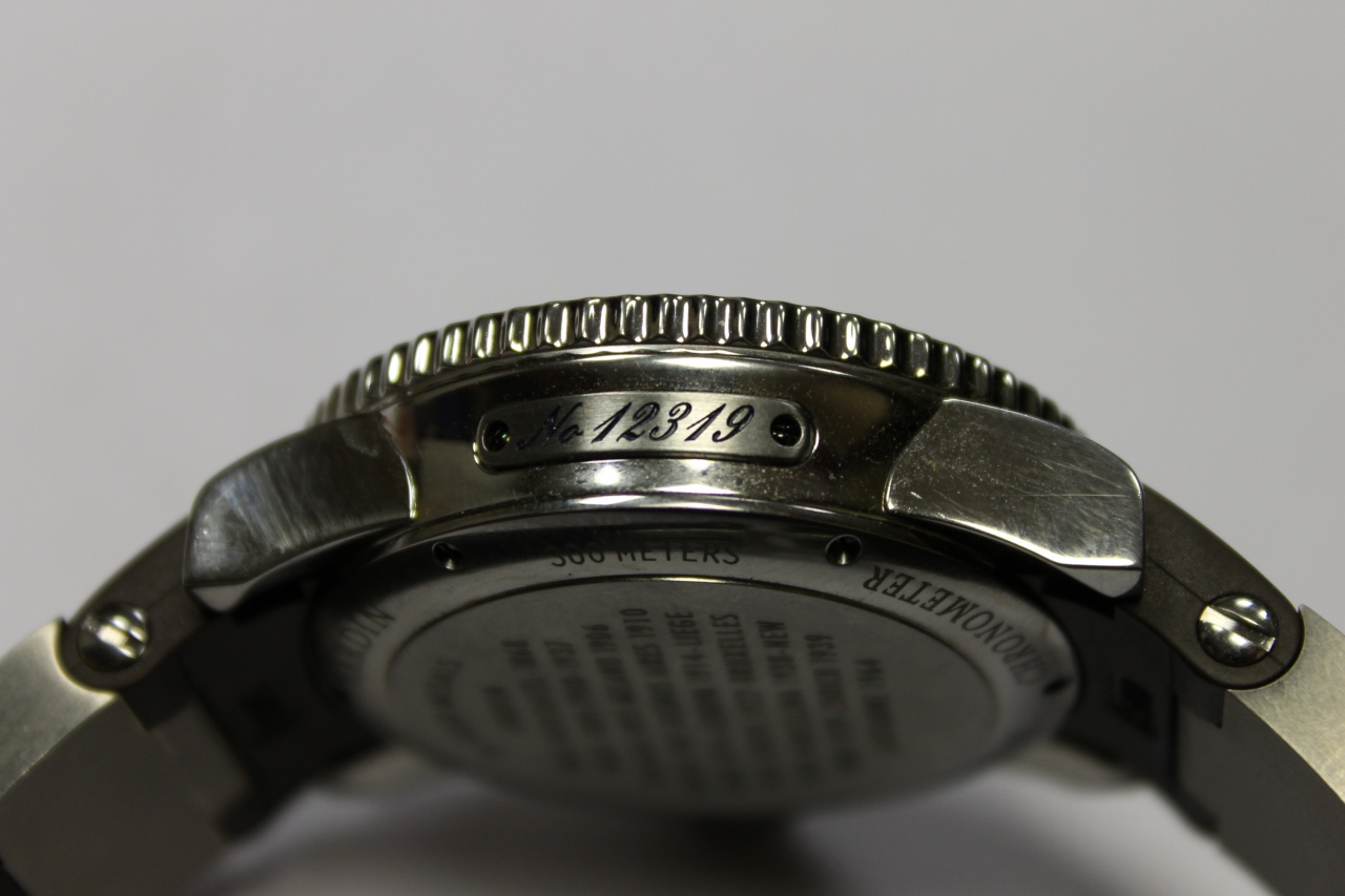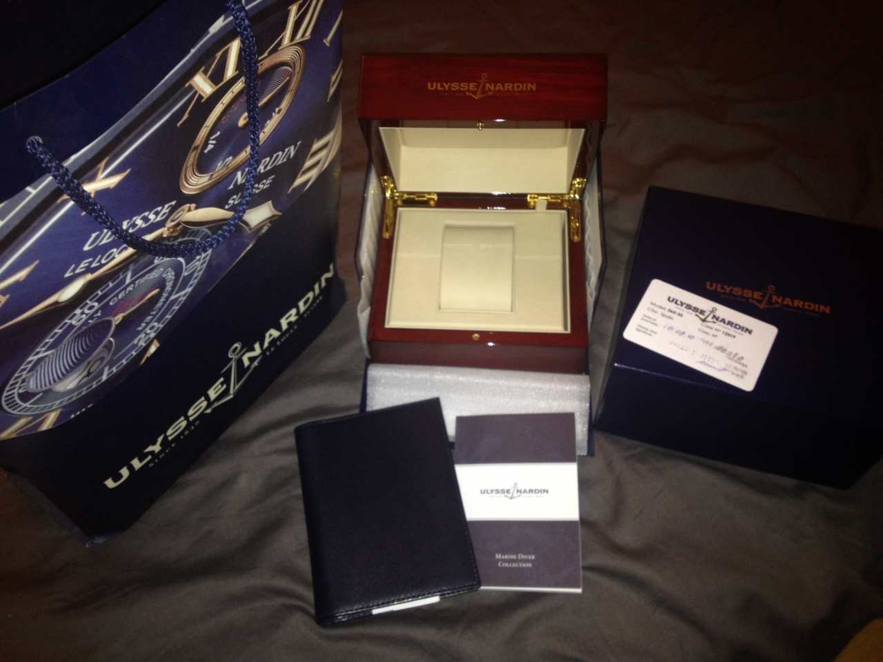 Уважаемые форумчане! Предлагаю Вашему вниманию часы Ulysse nardin Maxi Marine Diver. Куплены за границей в официальном магазине в 2010 г. Коричневый циферблат (цвет бургундия), оригинальный коричневый каучук (обрезан под обхват руки 19 см). Размер корпуса 42,7 мм., корпус сталь, стекло сапфир, механика с автоподзаводом, водонепроницаемость 300 м. Работают идеально, состояние отличное, носились аккуратно, есть незначительные следы носки на титановых вставках и каучуке. В комплекте коробка и документы. Цена 165000 руб.