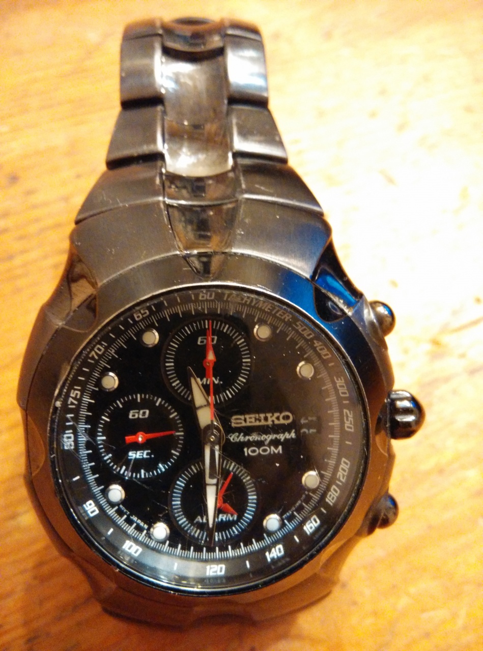 Hello, you are looking at a used Seiko Mens Seiko SNA 765 Chronograph Date Black Ion Men's Watch. It is in excellent running condition. The case has a small dent near the glass, the band has some light scratches. Comes with the watch and some extra band as seen on the pictures. This auction comes with the watch and the extra bands only.