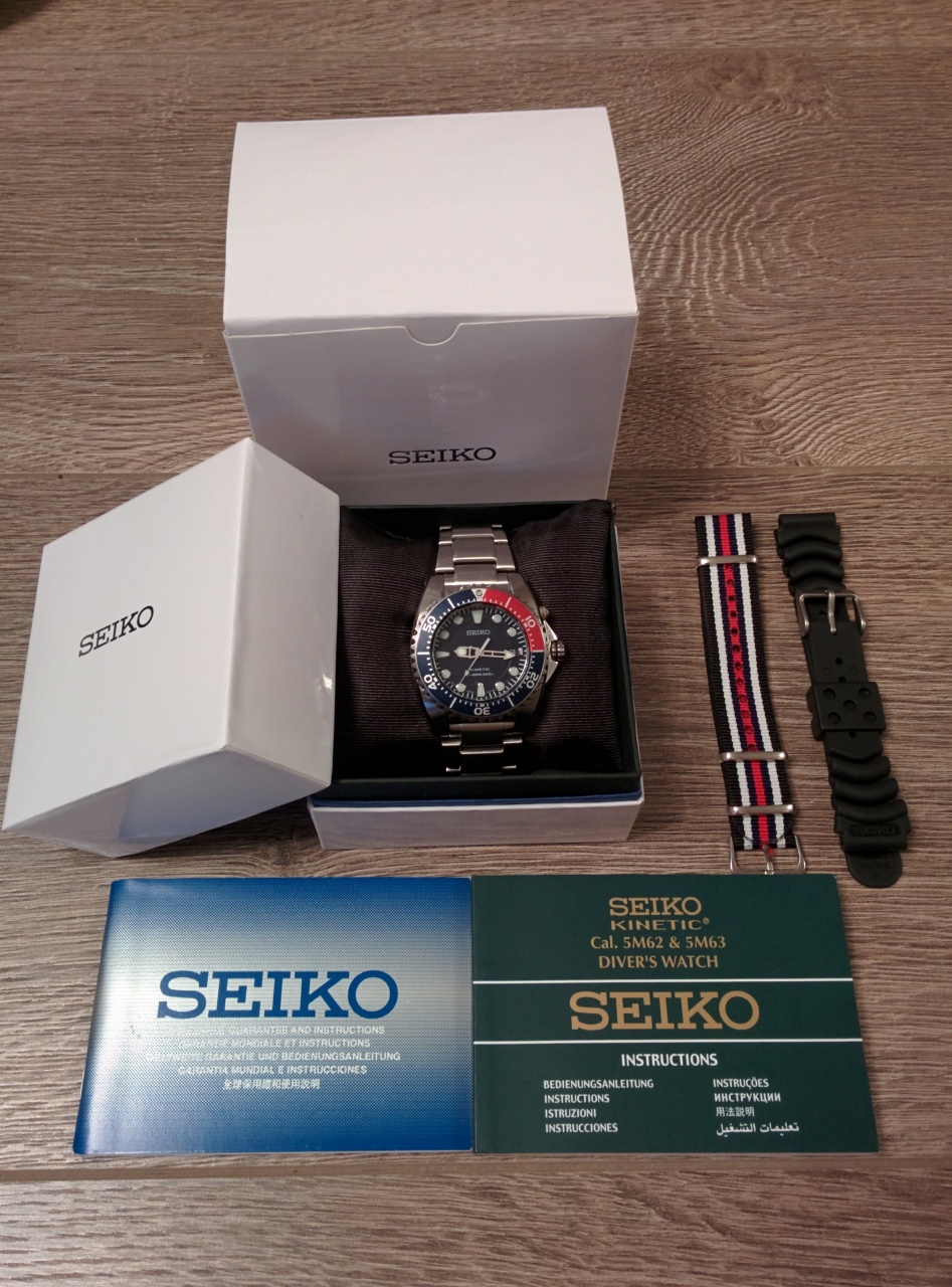 Продаю брутальный кинетический дайвер Seiko SKA369P1 Pepsi. Часы покупались год назад новыми у уважаемого форумчанина. Есть маленькие царапины на браслете и на безеле, ничего критичного (видно на фото), стекло без царапин. Полный комплект + оригинальный каучуковый ремешок (новый) и дешевенький нато. Вообщем, полный набор на лето! К часам никаких нареканий, продаю по причине покупки Сумо синеньких