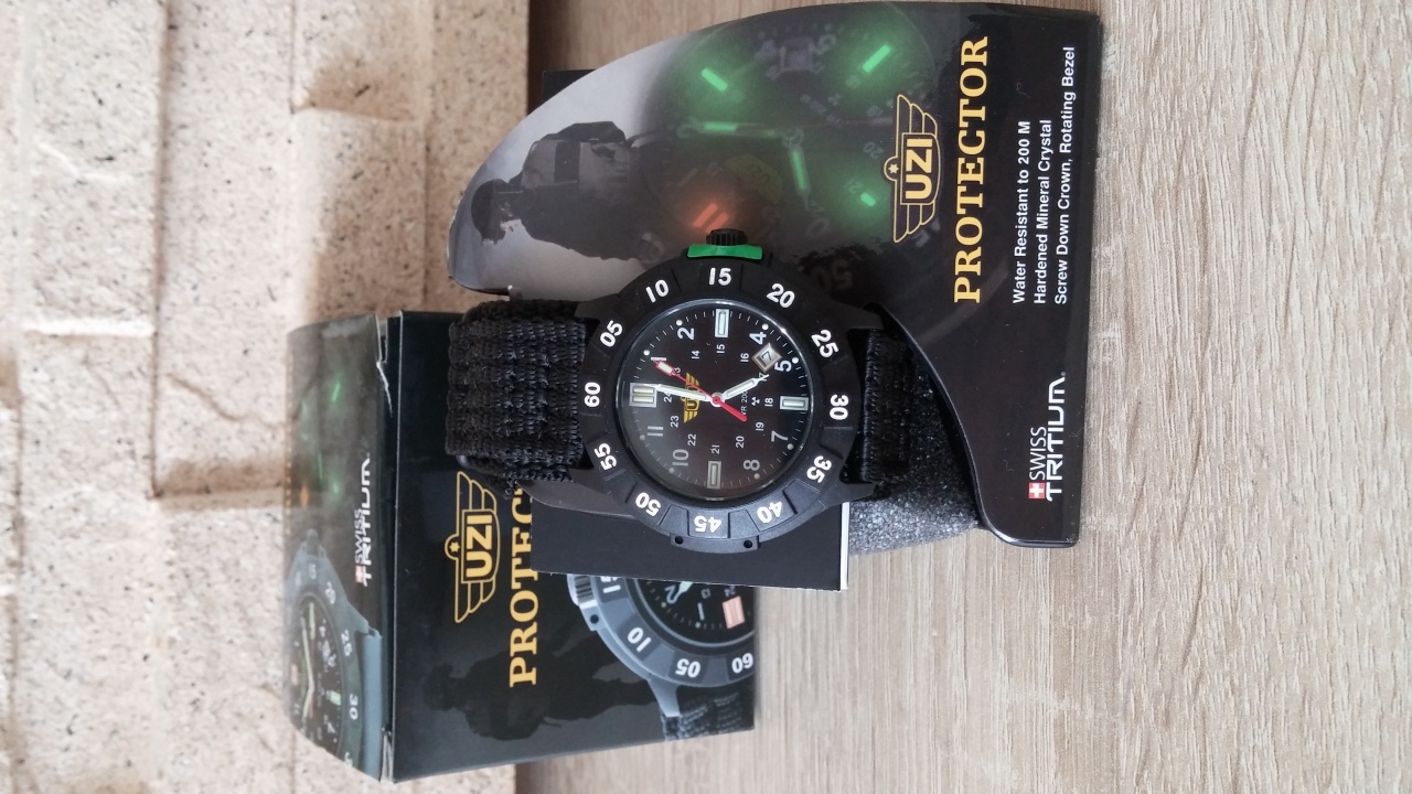 Всем доброго времени суток! Около месяца искал милитарный трёхстрелочник для работы. Выбор пал на UZI Protector из- за оптимального соотношения цены и качества. Все другие часы с технологией Н3 начинаются от 200 евро, мои UZI стоили 89,90. Сегодня пришла посылка с часами. Первое впечатление, часы вживую выглядят намного симпатичнее, чем на картинке. Мех тайваньский, о чём честно написано на задней крышке часов. Тритиевые трубочки светят в темноте отлично, ЗГ на резьбе(!). сами часы очень лёгкие и с натовским ремешком приятно лежат на руке. Из за широкого базеля, сам чаы смотрятся меньше 43мм. Высота могла бы быть неско пониже, но этот "недостаток" уже через 10 мин. перстал замечать. Думал, что жёлтый логотип будет несколько портить цифер, но к счастью ошибся,смотртся гармонично. В воде пока не мочил, но надеюсь, что хотя бы половина из заявленных 200 метров водостойкости сответствует действительности. Не знаю, как часы поведут себя дальше(точность хода,водостойкость,противоударность), через недели две отпишусь. Если у кого есть такие же, поделитесь впечатлениями. Пишу с телефона, поэтому пока без фото(не грузятся почему-то), уж очень хотелось поскорей поведать миру о своей обновке ))) Но обещаю в ближайшее время и во всей красе!
