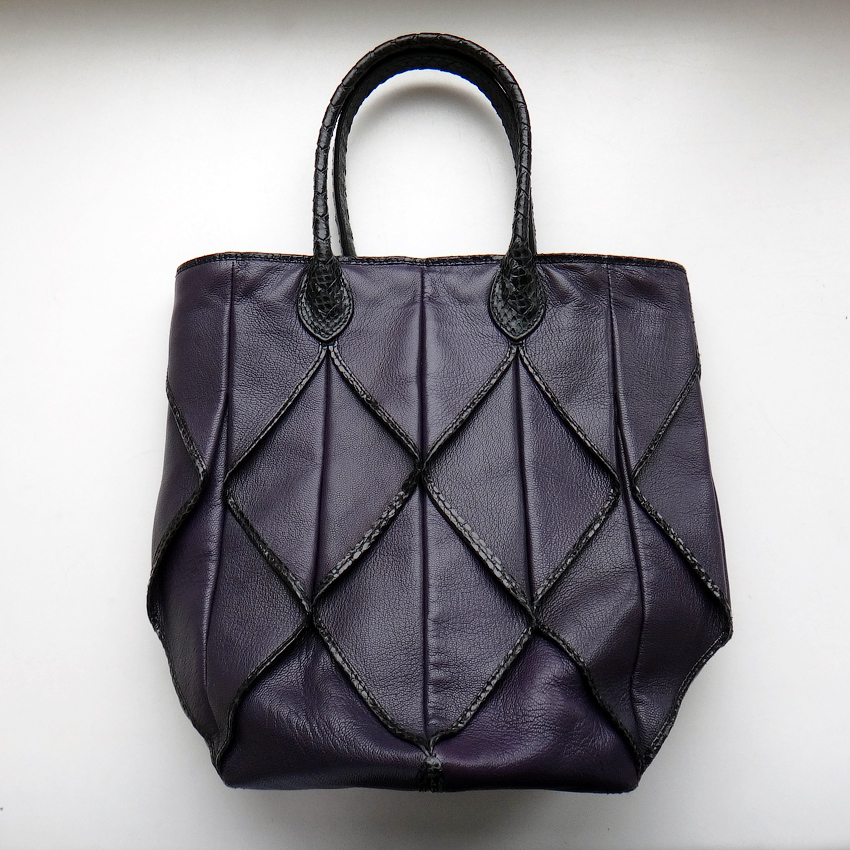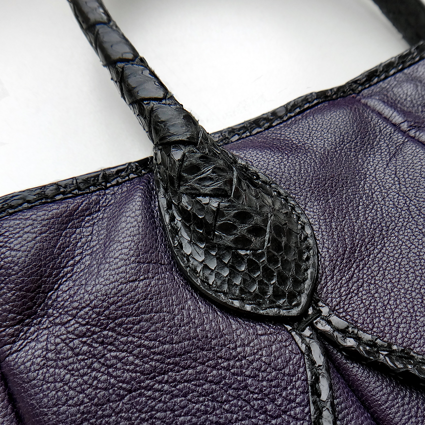 Сумка красивого, глубокого фиолетово-сливового цвета, из мягчайшей кожи великолепной выделки, драпированной в рельефные ромбовидные складки. Каждый ромб отделан по краям блестящей кожей змеи.