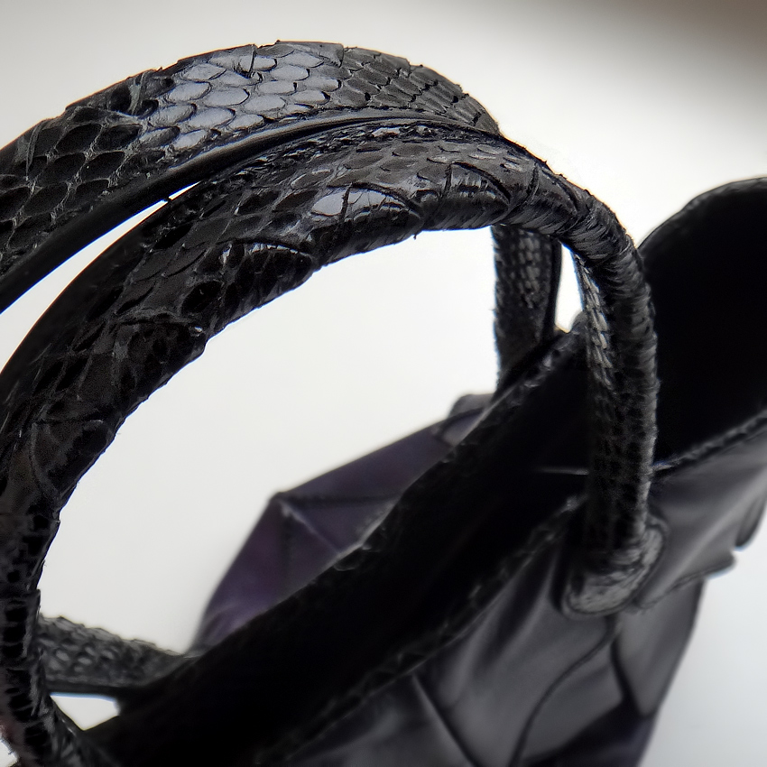 Ручки сумки полностью из кожи змеи, с фирменным плетением Bottega Veneta.