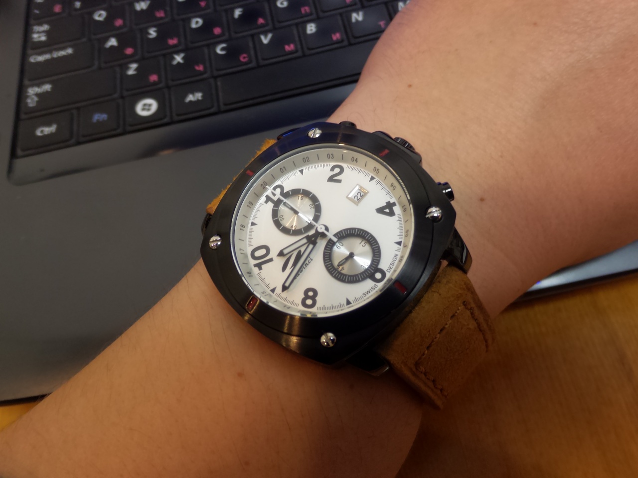 Часы пришли в прозрачной коробке, надёжно закрепленные вспененным пластиком. Часы на ходу, в рабочем состоянии. Корпус часов действительно похож на сталь - безель и верх имеют черненое браширование. Стекло, видимо недорогое, как будто бы даже и не кристально прозрачное. Циферблат имеет цвет алюминия с теплым оттенком и мелко зернистой структурой поверхности, обозначения цифр нарисованы краской, есть накладные элементы на малых циферблатах. Стрелки имеют люм, но не мощный, светятся бледно зеленым. Окошко даты оформлено с претензией на аккуратность. Механизм работает уверенно, кнопки выполняют все свои функции, запускается секундомер. Ремешок установленный на часах сделан из трехслойной кожи, на вид не дешевый, толщиной 3,5-4мм, но коротковат для меня, хотелось бы ещё 1,5-2см. длины. Но продавец заботливо приложил ещё ремешок, попроще и потоньше, а к нему отвертку для замены. Всё удовольствие обошлось в 3600р. Ближайший конкурент по моделям со сходным качеством изготовления это Stuhrling, но ценник будет выше в 2-3 раза. Часы рекомендую для любителей подобных моделей.