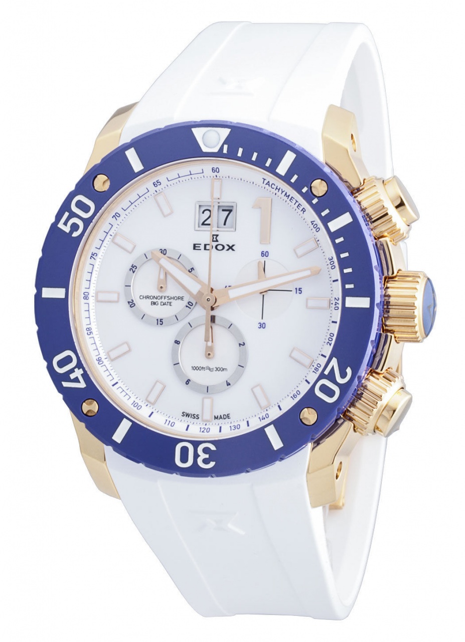 Мощный катер с двигателем V12 или V8 может достигать на воде скорость до 257 км/ч, морские гонки - это спорт, где мужество, выносливость, мастерство и грамотный расчет времени – основные составляющие успеха. Производство часов Chronoffshore 1 послужило началом успешного сотрудничества компании Edox с миром спорта, так она стала официальным хронометристом чемпионата по морским гонкам Chronoffshore 1. Чтобы отметить 10-летие своей коллекции Chronoffshore 1, Edox выпустил