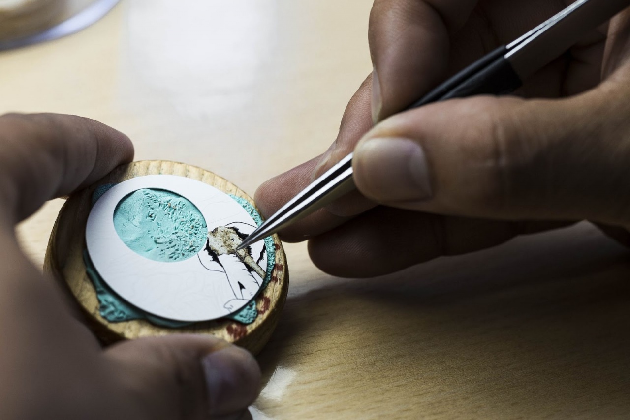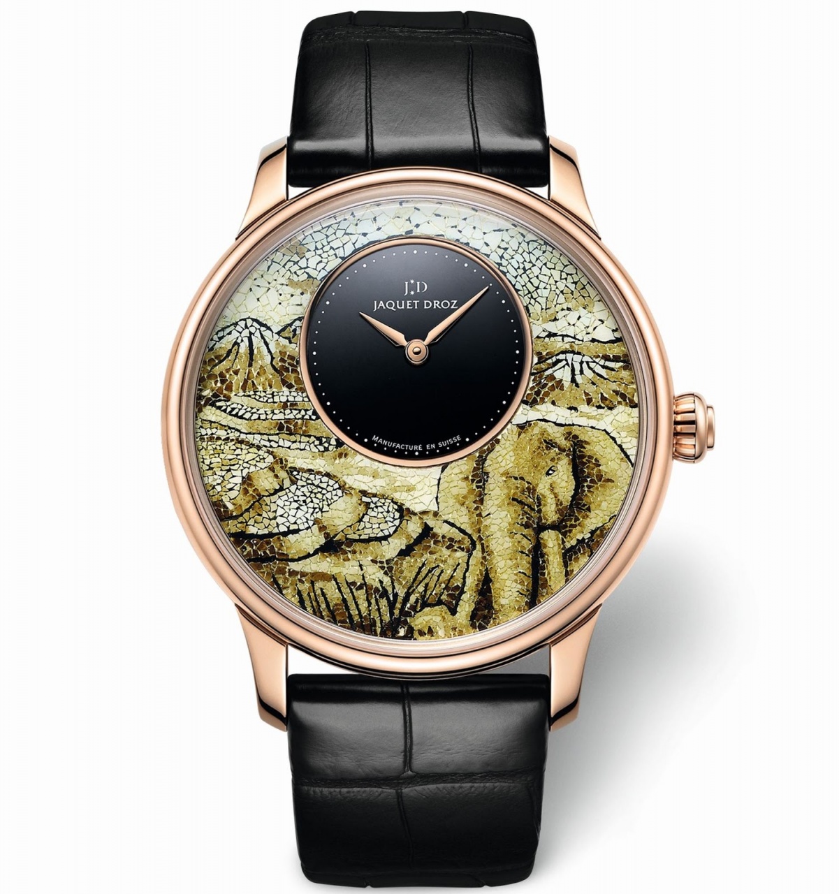 Новая лимитированная модель Petite Heure Minute Mosaic Elephant (Ref. J005033280) от швейцарской часовой компании Jaquet Droz отличается применением, впервые в часовом деле, трудоемкого азиатского искусства мозаики с использованием яичной скорлупы для создания миниатюрных художественных изображений.