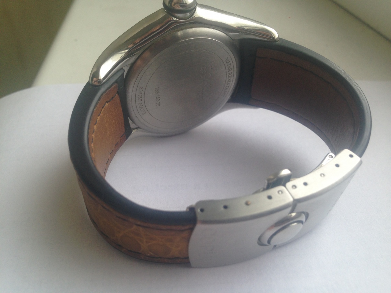 Часы в хорошем состоянии, имеются царапины на застёжке, очень мелкие на корпусе - от повседневной носки. Присутствуют царапины на задней крышке(последнее фото), сделанные "умелыми мастерами", которые меняли батарейку по просьбе предыдущего владельца. Ремешок не в идеальном состоянии, опять же, из-за повседневной носки, внутренняя кожаная часть ремешка перешивалась предыдущим владельцем, наружняя кожа немного потемнела, постарался передать это на фото.