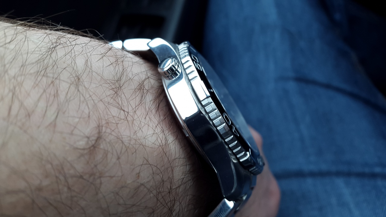 Продаю самый красивый и универсальный механический акварейсер в коллекции, с керамическим безелем и красивым гильоше на цифере. Покупался в Консуле в Питере в декабре 2014 года, еще 10 месяцев гарантии. Отличное состояние видно по фото, есть следы от естественной носки на застежке браслета. Браслет укорочен на запястье 17 см, дополнительные звенья естественно в комплекте. Комплект полный (коробка + бумаги+ гарантийная карта и чек)