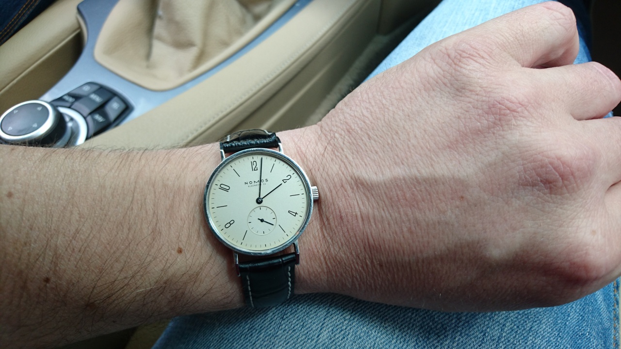 Есть возможность приобрести вот такой номос. Насколько знаю из раздела, первый Tangente, сзади полностью металлическая крышка, серебристо-молочный (наверное от времени) цифер, стрелки скорее черные, чем синие. На коронке есть надпись NOMOS. По внешнему виду нет сомнения,что оригинал.