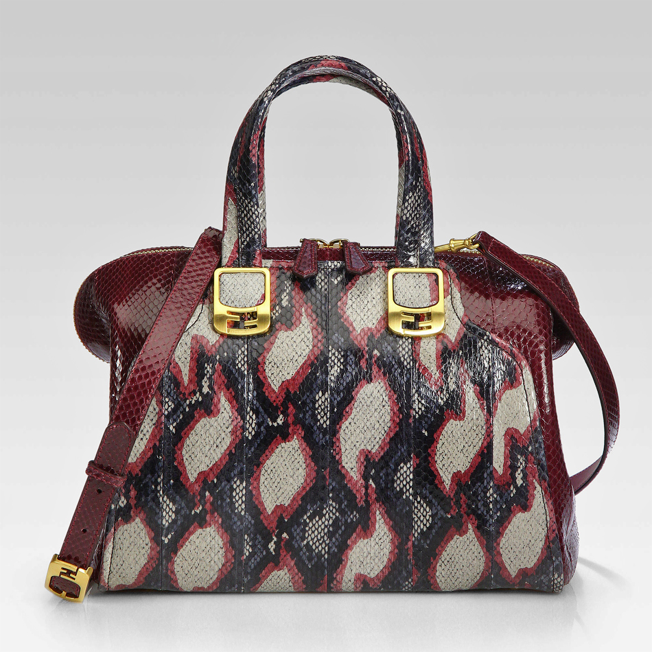 Сделана с использованием двух разных видов змеи (водной змеи и питона). Окрашена вручную в ярких тонах. Внутри - вместительное внутреннее отделение, удобно разделенное на две части плоским отделением-кошельком. Подкладка - фирменная плотная ткань с логотипами Fendi.