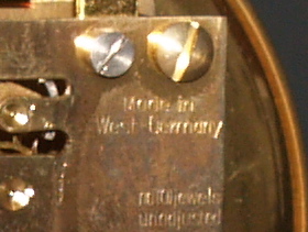 Практика показывает, что на часах, произведенных в период с 1949 по 1991 встречаются все возможные варианты: "Germany", "Made in Germany", "Made in W. Germany", "Made in West Germany", "West Germany" и тп и тд. Более того, бывают и такие курьезные случаи, что даже на одних и тех же часах можно встретить три совершенно разных варианта. И вот пример (фотки из статьи английского журнала Clocks, как раз посвященной этой теме). На циферблате одно, на механизме другое, а на подставке третье: