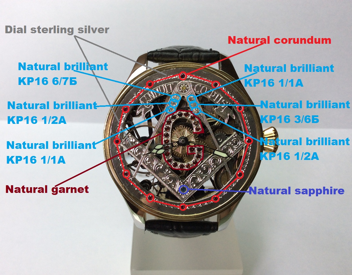 Циферблат: изготовлен из серебра и украшен натуральными камнями (природные бриллианты и природные корунды, сапфир, гранаты см. фото, я подготовил для вас схему-описание).