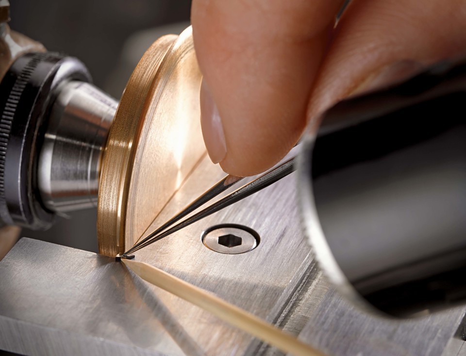 Анкерный ход гласхюттовского типа – дань уважения традициям Lange, согласно которым и анкер, и анкерное колесо производится из закаленного 18-каратного золота. При изготовлении этих деталей не обойтись без длительной ручной доводки деталей, так как на станках все операции произвести невозможно. Здесь показан процесс закругления поверхности плеча анкера, в которое вставлена рубиновая палета, на внутренней поверхности вращающейся медной трубки.