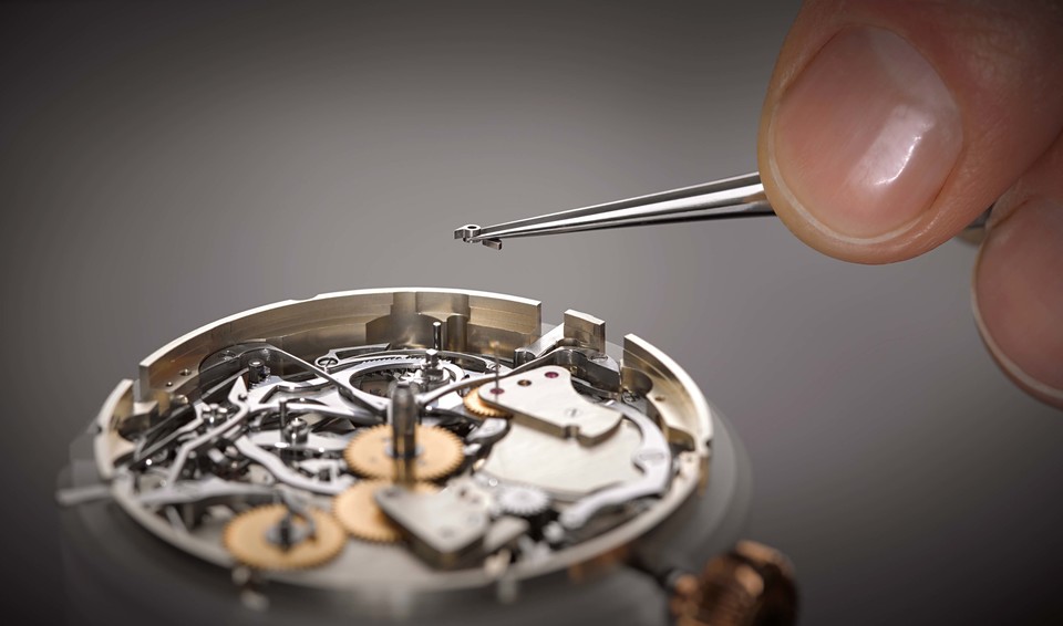 Обычно камни устанавливают в механизм, просто запрессовывая их. В часах Grand Complication все камни со стороны мостов устанавливаются в специальные оправы, то есть так, как это раньше делалось при сборке карманных часов престижной категории. Здесь показано, как на часовом токарном станке производится установка камня в мост сплит-хронографа.