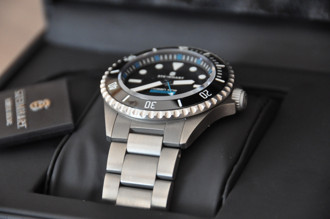 STEINHART OCEAN Titanium 500 Premium. Куплены неделю назад в Германии на официальном сайте, но не зацепили. Дайверы, вероятно, не мое. Сатинированный титановый корпус и браслет, сапфировое стекло, механизм Soprod A10-2, стоп-секунда, крутящийся безель, дата на 18 часах, завинчивающаяся заводная головка, диаметр 42 мм.. Удобные, легкие, прекрасная считываемость (в том числе и в темноте).