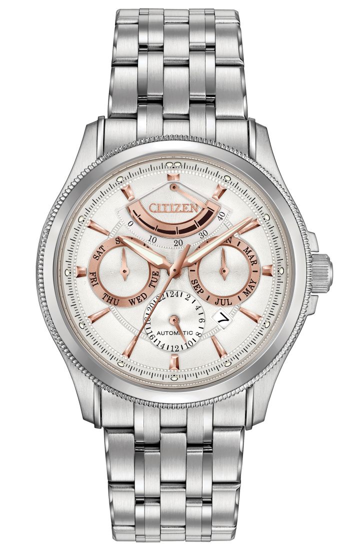 Японская часовая компания Citizen представила свою новую модель Grand Classic Signature Power Reserve, которая выполнена в двух версиях: в нержавеющей стали с циферблатом серебристого цвета и с браслетом из нержавеющей стали, а также в нержавеющей стали с заводной головкой из нержавеющей стали с PVD-покрытием из 18-каратного розового золота, с темно-серым циферблатом и с биколорным браслетом (из нержавеющей стали и нержавеющей стали с PVD-покрытием из 18-каратного розового золота).