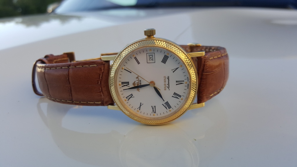 Продам Appella 18K Solid Gold. Материал - золото. Классический дизайн, автоматический механизм, сапфировое стекло, рифлёный безель, прозрачная задняя крышка через которую виден механизм, кожаный ремень (заменял, но оригинальный тоже сохранил). Идут идеально точно. Носил года два, теперь в основном лежат без дела. Царапин нет. Имеется сертификат, инструкция, гарантийный талон, фирменная деревянная коробка (и внешняя картонная упаковка тоже осталась), чек о покупке у офиц. представителя (почти за 100т.р. в 2010 году). На руке сидят удобно, смотрятся очень красиво и дорого. Местонахождения - Тюмень.