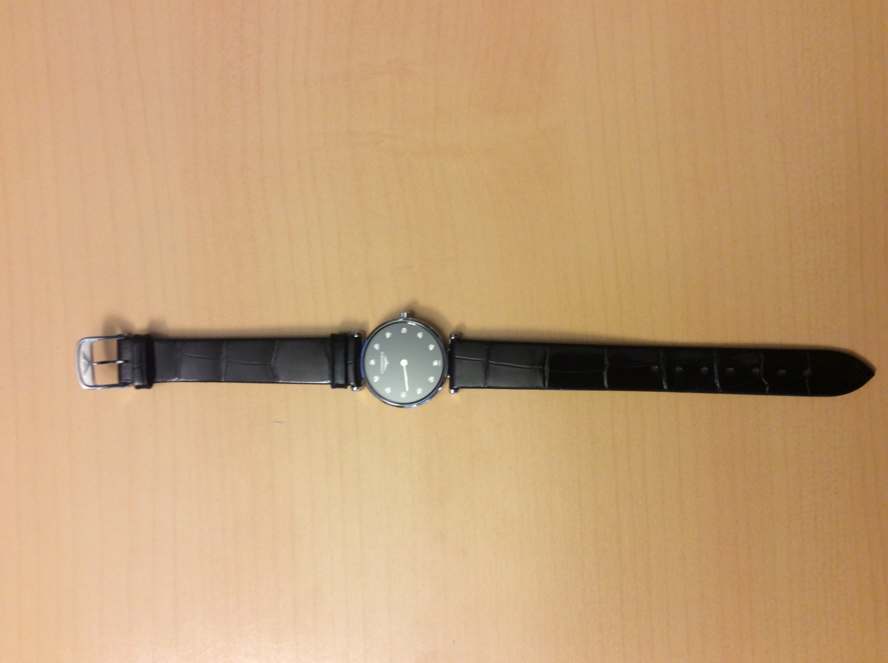 Материал корпуса- нержавеющая сталь, ремешок из кожи аллигатора, черный циферблат с 12 бриллиантами.